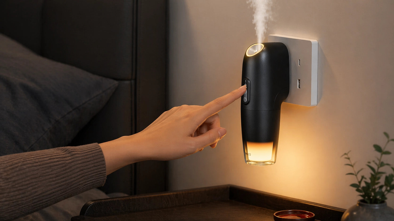 A compact wall plug-in waterless aroma diffuser designed to save space while elevating everyday scenting. It plugs directly into a power outlet with no countertop required, making it ideal for bedrooms, offices, apartments, hotels, hallways, and other compact spaces.